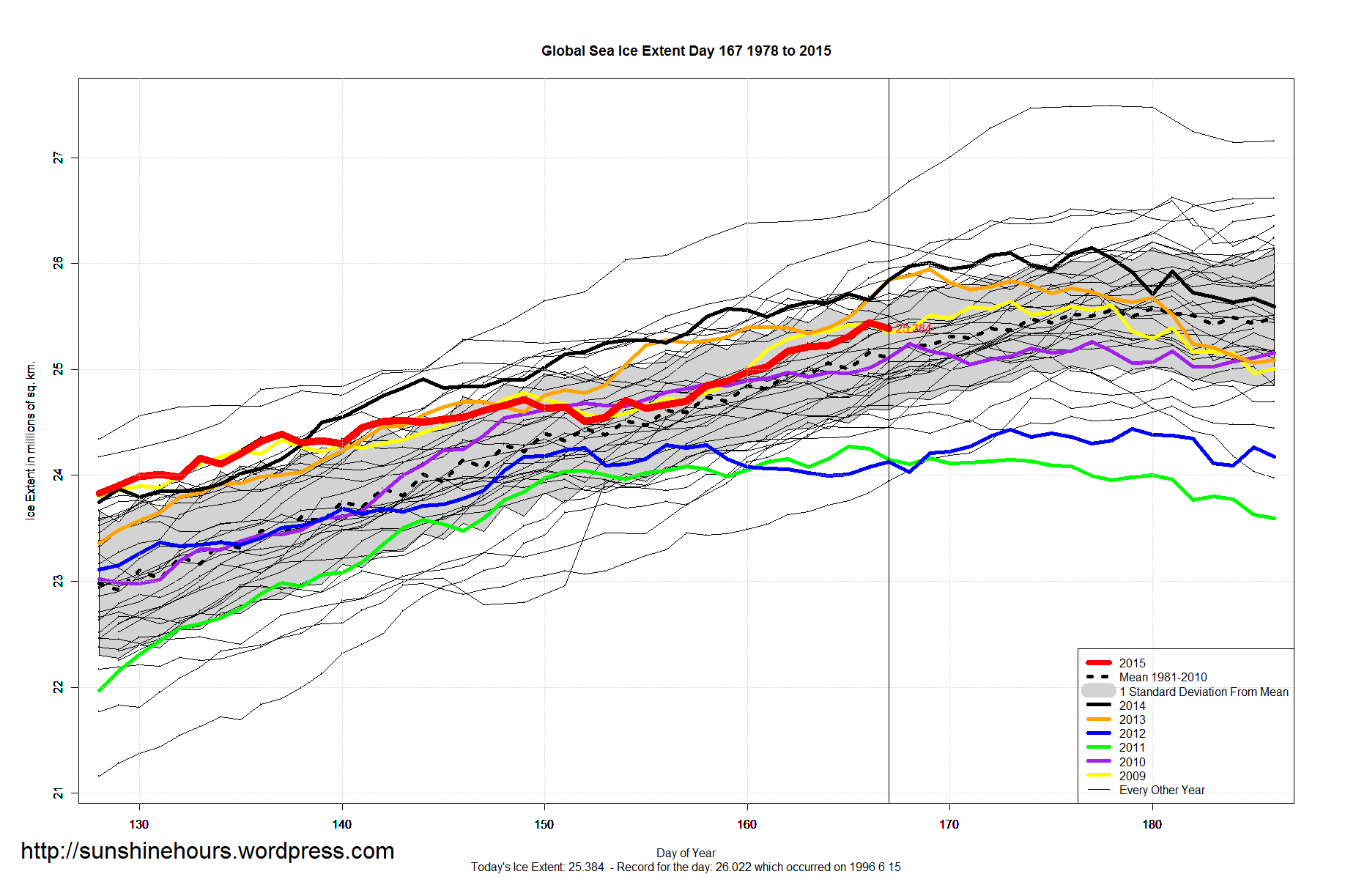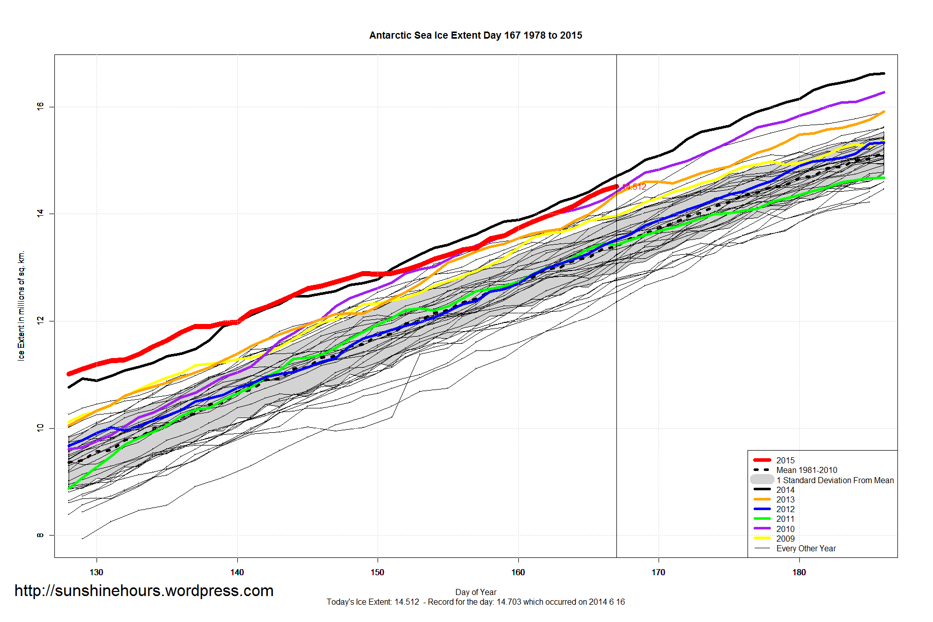 2 thoughts on “Sea Ice Extent – Day 167 – Antarctic 2nd Highest – Global 15th Highest For This Day