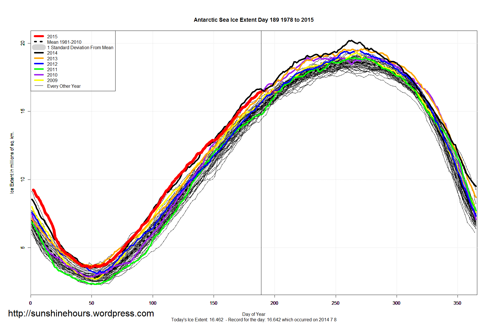 Sea Ice Extent – Day 189 – Antarctic 2nd Highest – Global 13th Highest For This Day Published on July 9, 2015 by sunshinehours1 2nd Highest Antarctic Sea Ice For This Day – 1.2 million above the 1981-2010 mean. – Above 2 standard deviation. 13th Highest Global Sea Ice For This Day – Above the 1981-2010 mean. The big view for a change: South / North Share this: Share on X (Opens in new window) X Share on Facebook (Opens in new window) Facebook Like Loading... Related