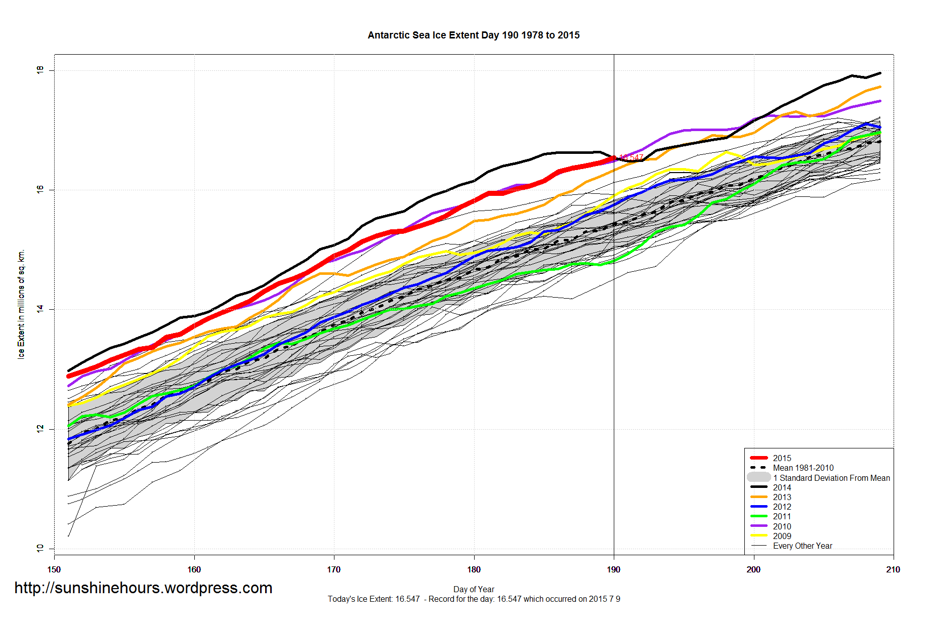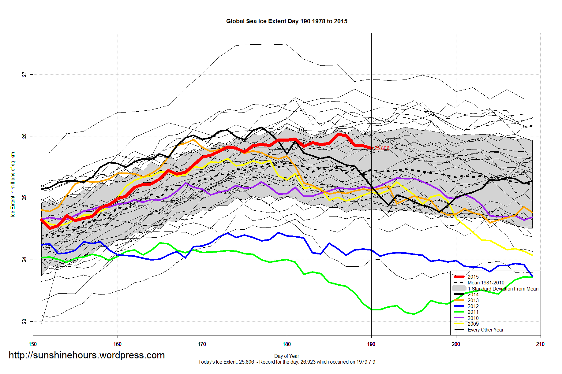 Sea Ice Extent – Day 190 – Antarctic Highest – Global 12th Highest For This Day Published on July 10, 2015 by sunshinehours1 Highest Antarctic Sea Ice For This Day – 1.15 million above the 1981-2010 mean. – Above 2 standard deviation. 12th Highest Global Sea Ice For This Day – Above the 1981-2010 mean. South / North Share this: Share on X (Opens in new window) X Share on Facebook (Opens in new window) Facebook Like Loading... Related