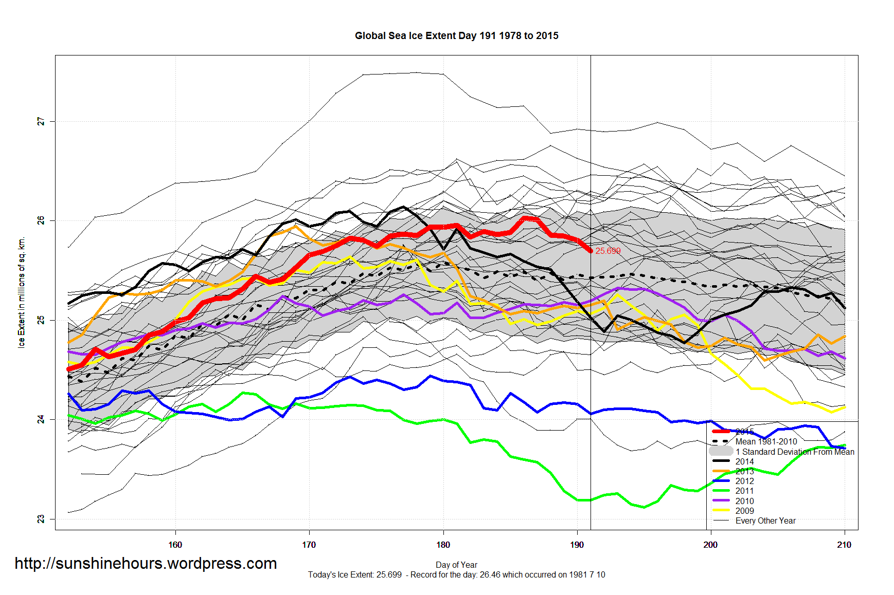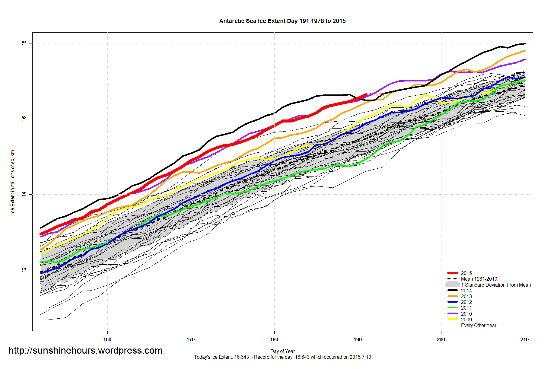 Sea Ice Extent – Day 191 – Antarctic Highest – Global 17th Highest For This Day Published on July 11, 2015 by sunshinehours1 Highest Antarctic Sea Ice For This Day – 1.15 million above the 1981-2010 mean. – Above 2 standard deviation. 17th Highest Global Sea Ice For This Day – Above the 1981-2010 mean. South / North Share this: Click to share on X (Opens in new window) X Click to share on Facebook (Opens in new window) Facebook Like Loading... Related