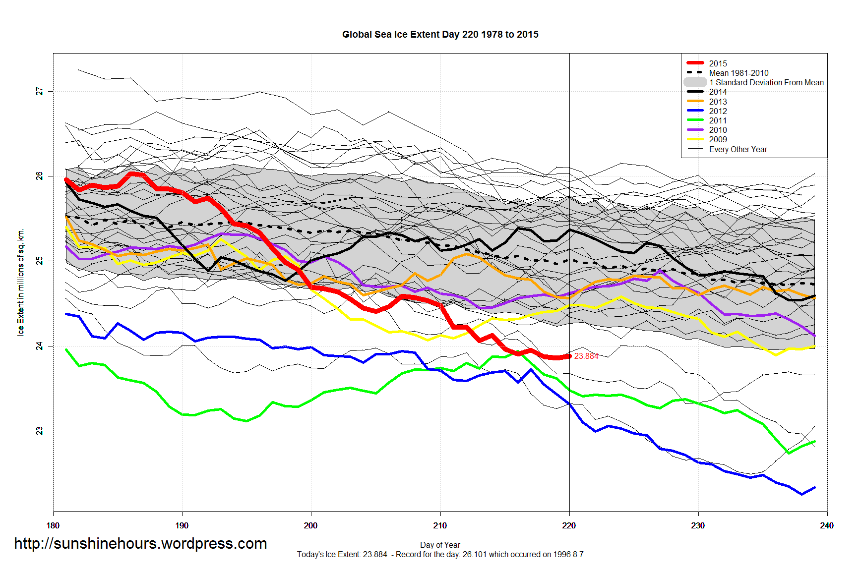 Sea Ice Extent – Day 220 Published on August 9, 2015 by sunshinehours1 South / North Share this: Click to share on X (Opens in new window) X Click to share on Facebook (Opens in new window) Facebook Like Loading... Related