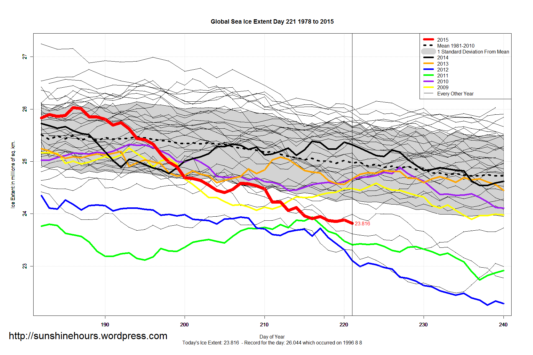 Sea Ice Extent – Day 221 Published on August 10, 2015 by sunshinehours1 South / North Share this: Click to share on X (Opens in new window) X Click to share on Facebook (Opens in new window) Facebook Like Loading... Related