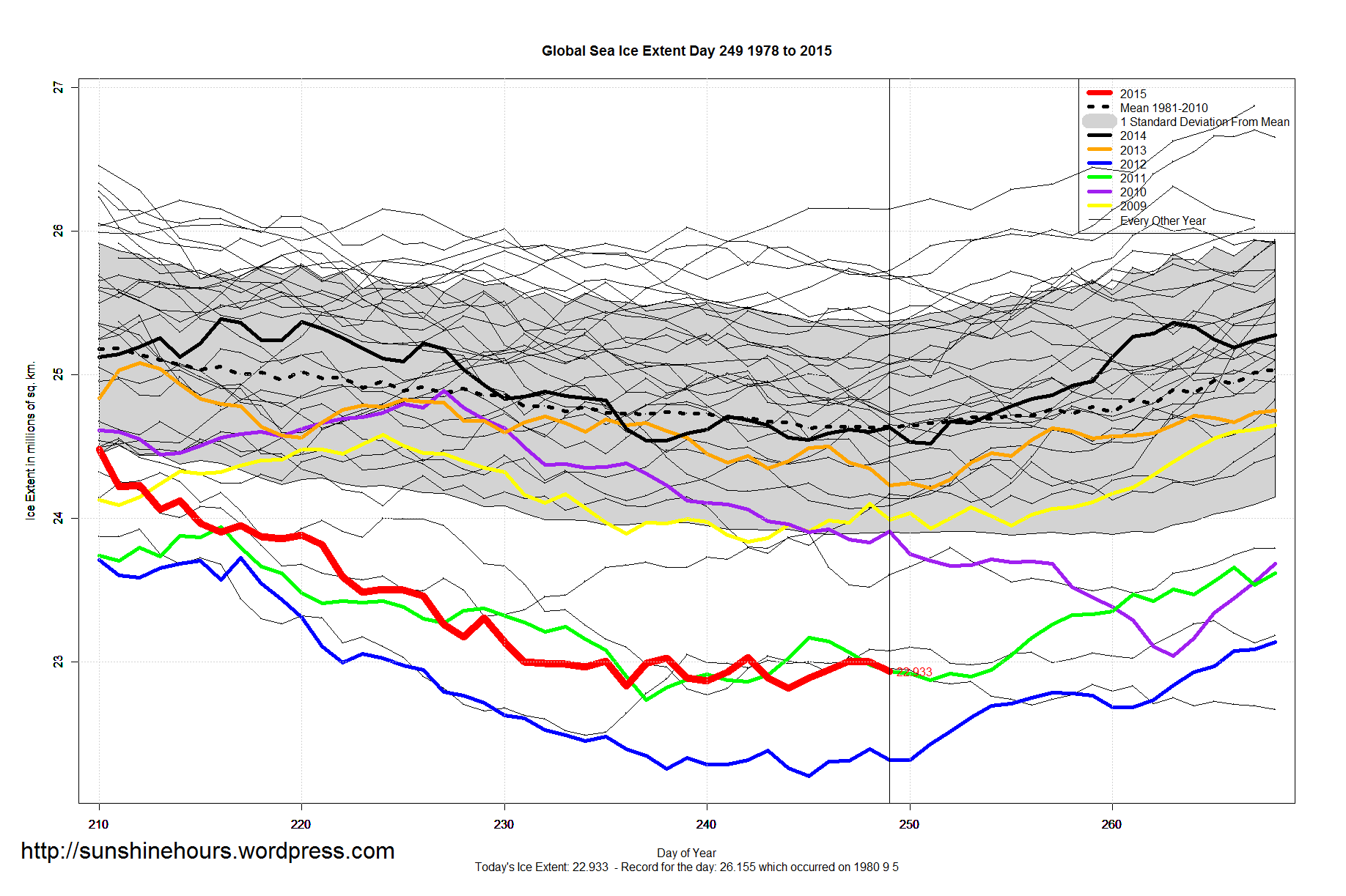 Sea Ice Extent – Day 249 – Arctic Day 244 and 248 Tied For Minimum So Far Published on September 7, 2015 by sunshinehours1 Arctic Day 244 and 248 Tied For Minimum So Far – Day 249 was 3,000 sq km above day 244/248 South / North Share this: Click to share on X (Opens in new window) X Click to share on Facebook (Opens in new window) Facebook Like Loading... Related