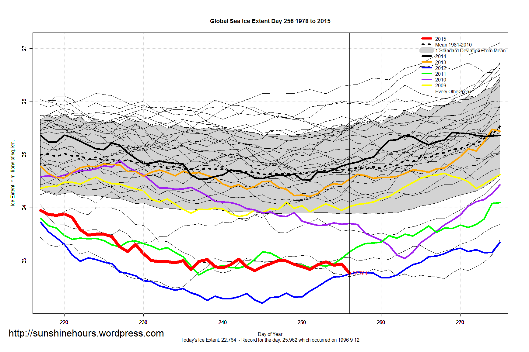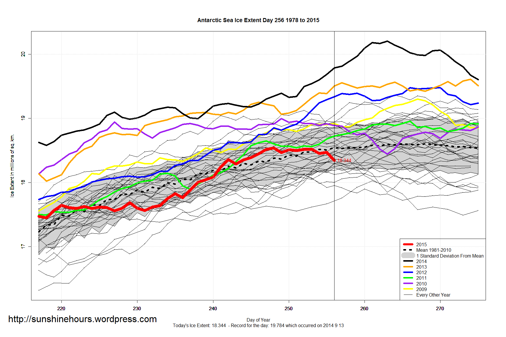 Sea Ice Extent – Day 256 Published on September 14, 2015 by sunshinehours1 South / North Share this: Click to share on X (Opens in new window) X Click to share on Facebook (Opens in new window) Facebook Like Loading... Related