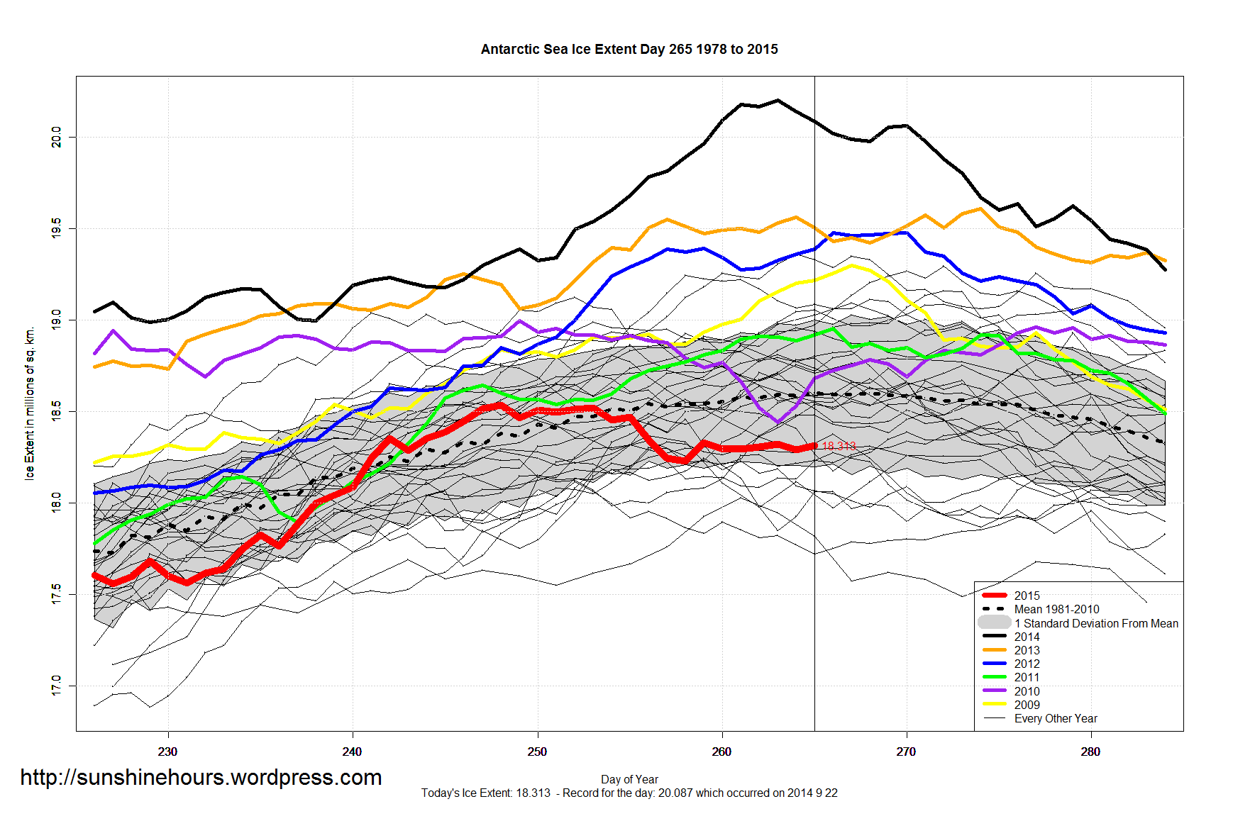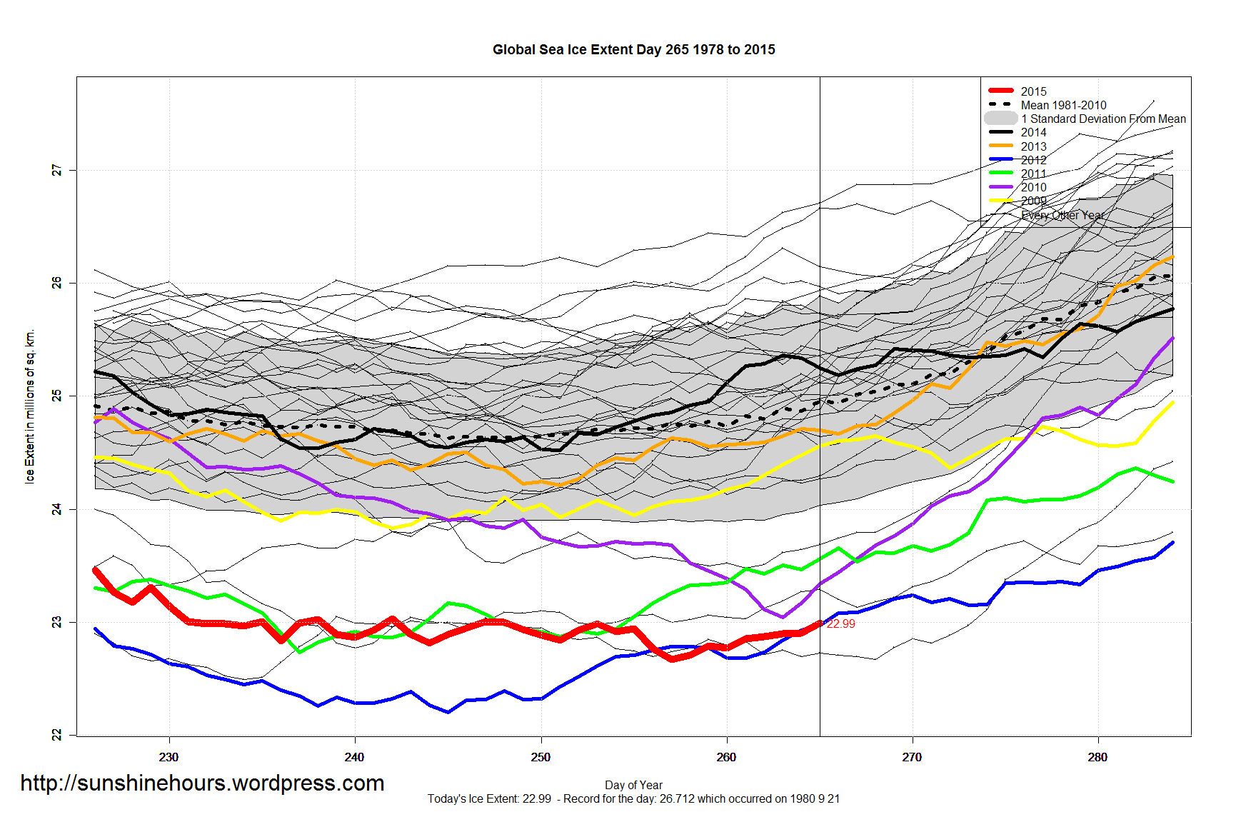 Sea Ice Extent – Day 265 – Arctic Higher Than 2010, 2008, 2011, 2007 and 2012 For The Day Published on September 23, 2015September 23, 2015 by sunshinehours1 South / North Share this: Click to share on X (Opens in new window) X Click to share on Facebook (Opens in new window) Facebook Like Loading... Related