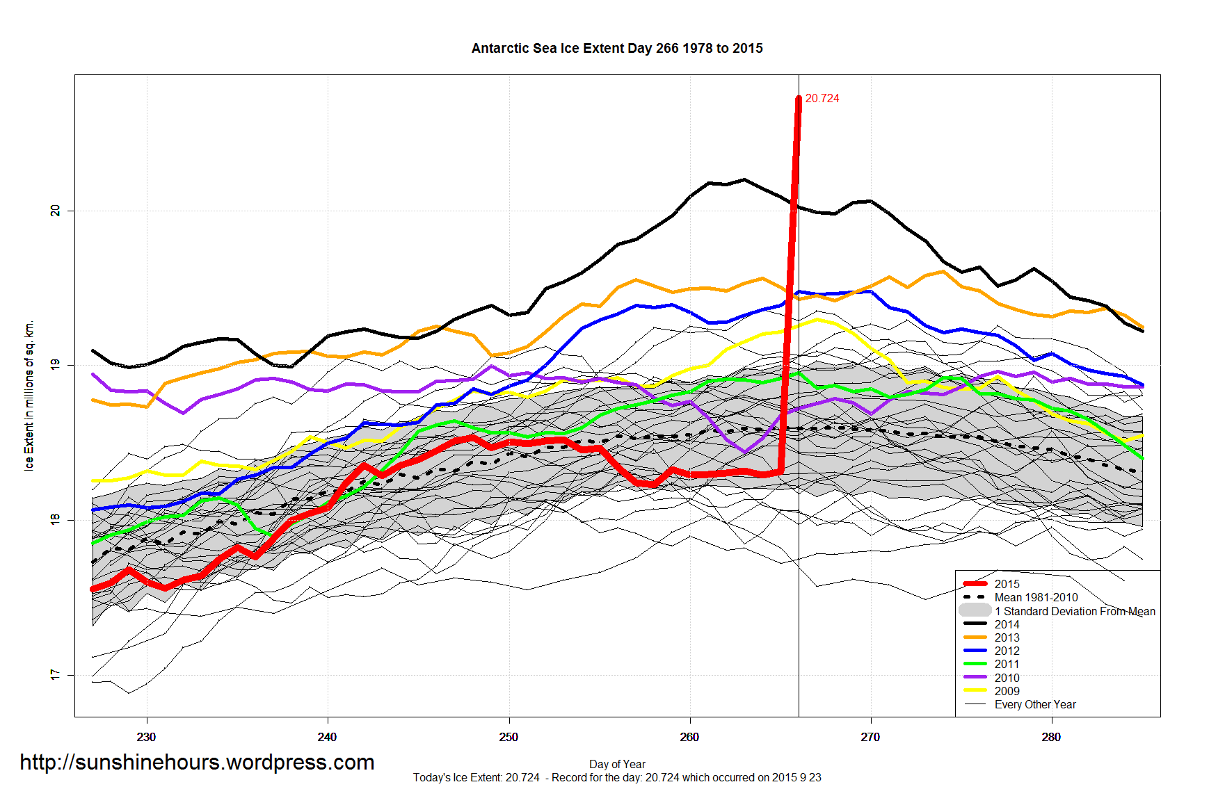 5 thoughts on “Sea Ice Extent – Day 266 – Strange Data – Antarctic Gains 2.4 million sq km in One Day