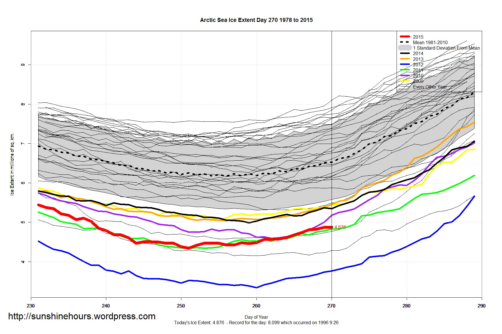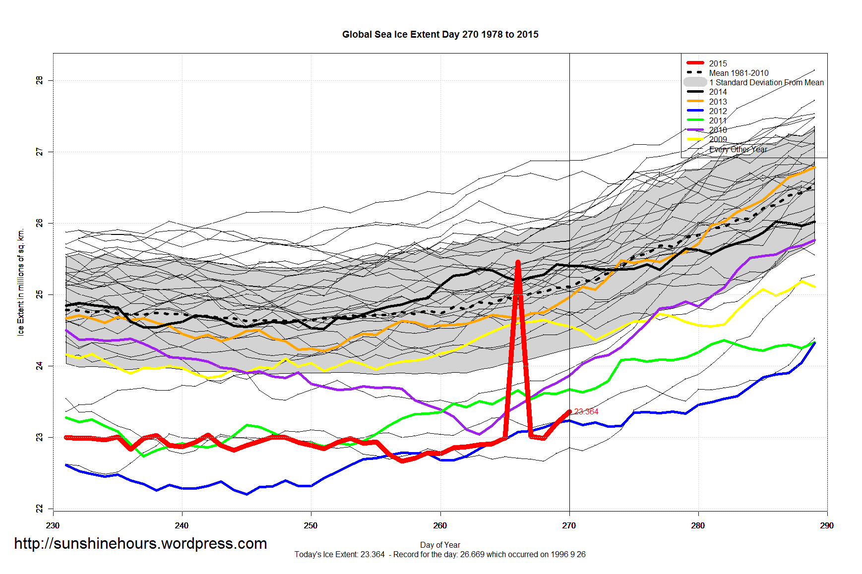 Sea Ice Extent – Day 270 Published on September 28, 2015September 28, 2015 by sunshinehours1 UPDATE: If NSIDC doesn’t fix the data … Antarctic will have set a 4th all-time record in 4 years. South / North Share this: Click to share on X (Opens in new window) X Click to share on Facebook (Opens in new window) Facebook Like Loading... Related