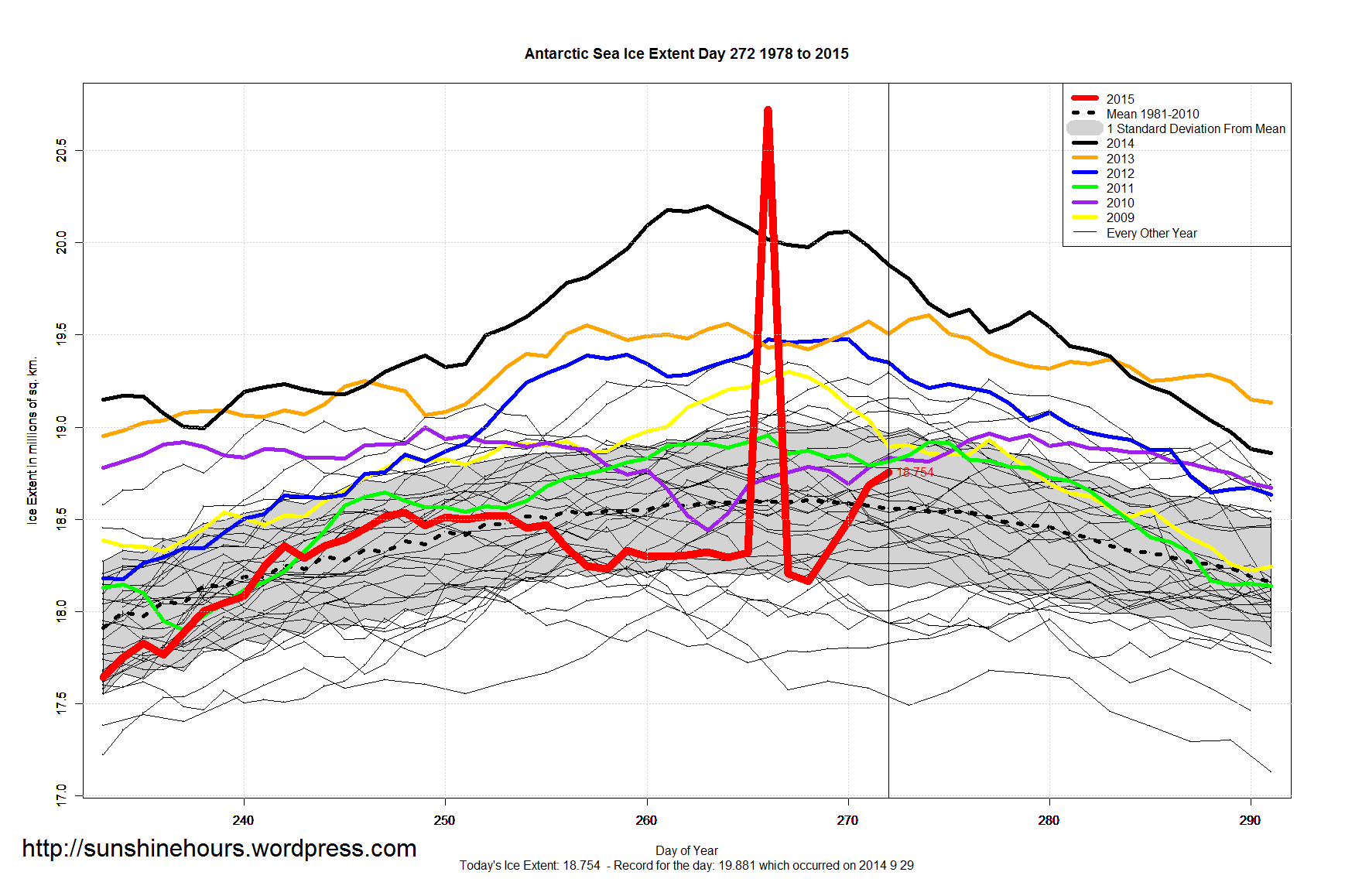Sea Ice Extent – Day 272 – Antarctic Still Climbing – 590,000 in 4 Days Published on September 30, 2015 by sunshinehours1 Ignoring the weird day, the day of Max is now day 272.The latest day of Max was 1988 when it occurred on day 277. Share this: Share on X (Opens in new window) X Share on Facebook (Opens in new window) Facebook Like Loading... Related