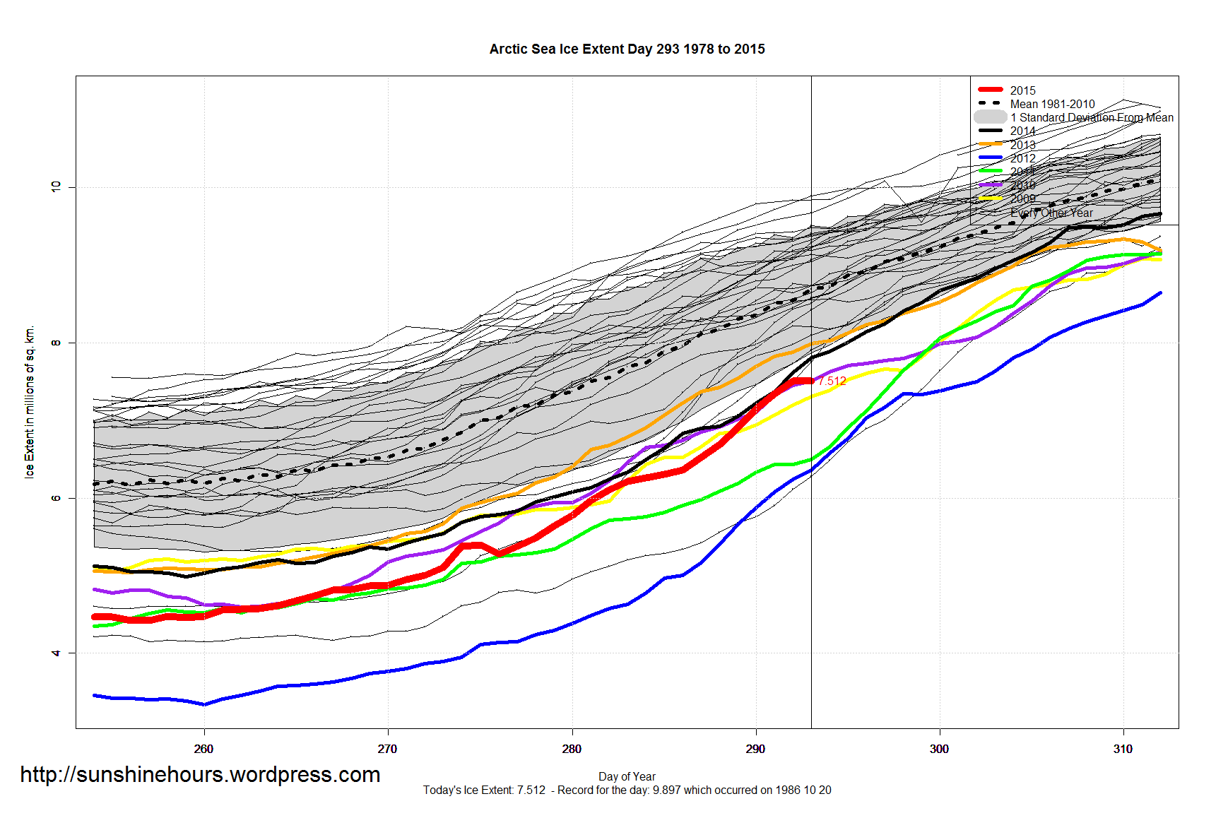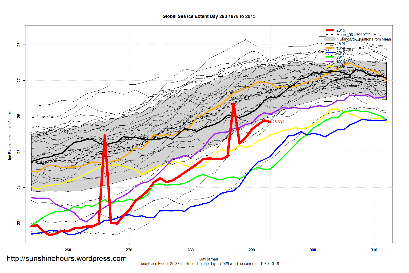 Sea Ice Extent – Day 293 Published on October 21, 2015 by sunshinehours1 South / North Share this: Click to share on X (Opens in new window) X Click to share on Facebook (Opens in new window) Facebook Like Loading... Related