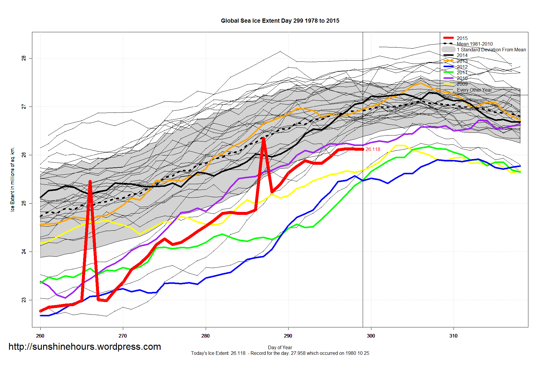 Sea Ice Extent – Day 299 Published on October 27, 2015 by sunshinehours1 South / North Share this: Click to share on X (Opens in new window) X Click to share on Facebook (Opens in new window) Facebook Like Loading... Related