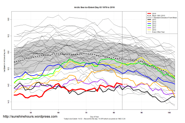 Sea Ice Extent (Global Antarctic and Arctic) – Day 83 – 2016