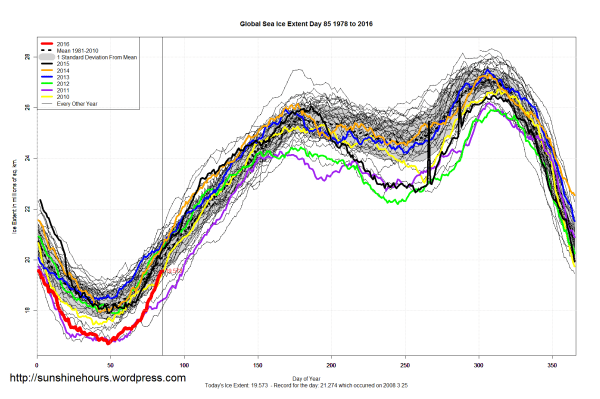 Sea Ice Extent (Global Antarctic and Arctic) – Day 85 – 2016
