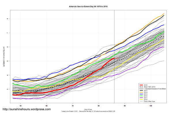 Sea Ice Extent (Global Antarctic and Arctic) – Day 86 – 2016