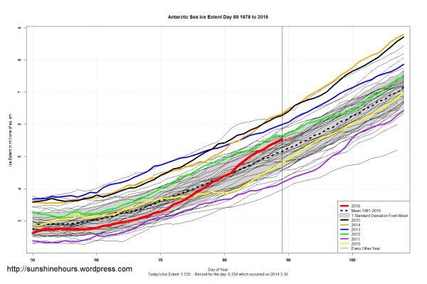 Sea Ice Extent (Global Antarctic and Arctic) – Day 89 – 2016