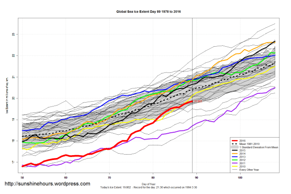 Sea Ice Extent (Global Antarctic and Arctic) – Day 89 – 2016