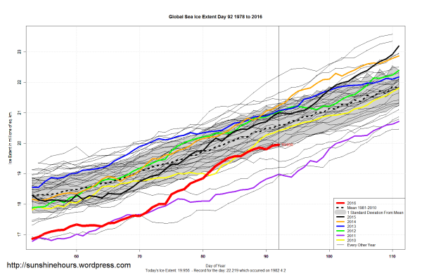 Sea Ice Extent (Global Antarctic and Arctic) – Day 92 – 2016
