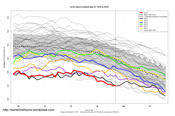 Sea Ice Extent (Global Antarctic and Arctic) – Day 97 – 2016