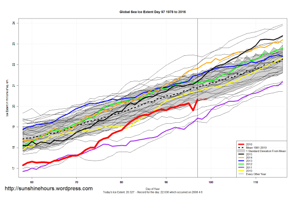 Sea Ice Extent (Global Antarctic and Arctic) – Day 97 – 2016