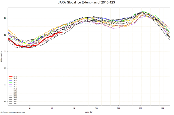JAXA Sea Ice Extent (Antarctic and Arctic and Global) – Day 123 – 2016