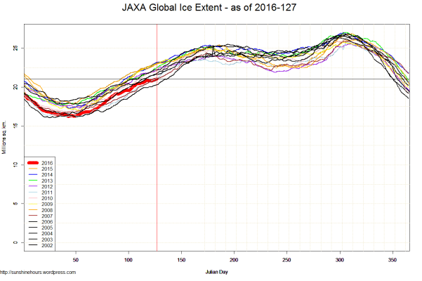 JAXA Sea Ice Extent (Antarctic and Arctic and Global) – Day 127 – 2016