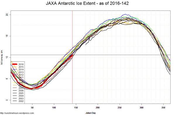 JAXA/MASIE Sea Ice Extent (Antarctic and Arctic and Global) – Day 142 – 2016