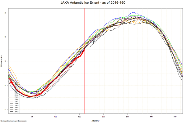 JAXA/MASIE Sea Ice Extent (Antarctic and Arctic and Global) – Day 160 – 2016