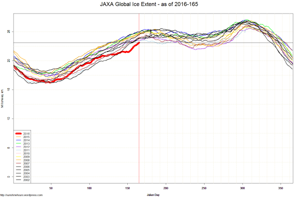 JAXA/MASIE Sea Ice Extent (Antarctic and Arctic and Global) – Day 165 – 2016