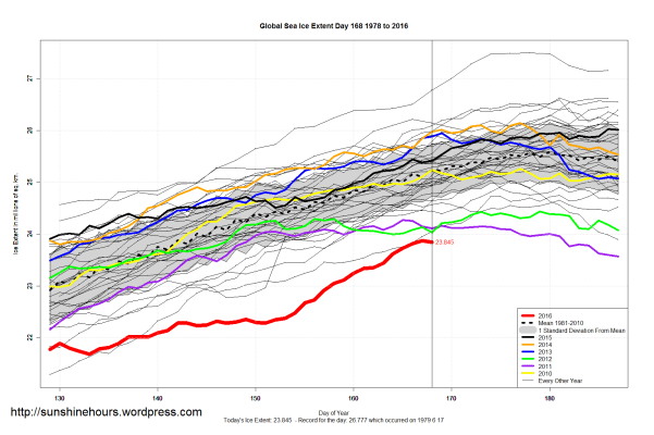 Sea Ice Extent (Global Antarctic and Arctic) – Day 168 – 2016