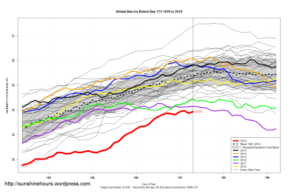 Sea Ice Extent (Antarctic and Arctic and Global) – Day 173 – 2016
