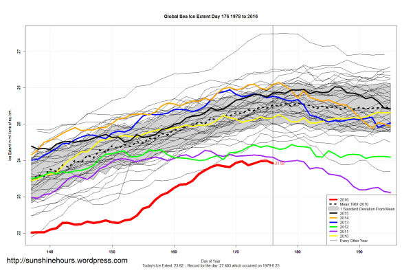 Sea Ice Extent (Global Antarctic and Arctic) – Day 176 – 2016