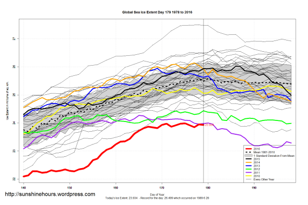 Sea Ice Extent (Global Antarctic and Arctic) – Day 179 – 2016
