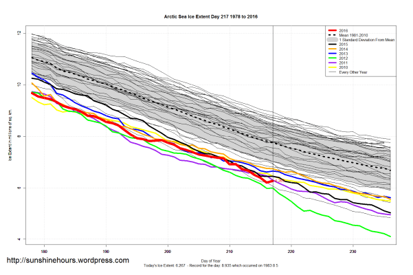 Sea Ice Extent (Global Antarctic and Arctic) – Day 217 – 2016