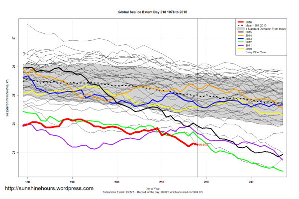 Sea Ice Extent (Global Antarctic and Arctic) – Day 218 – 2016