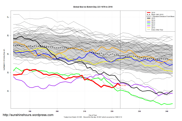 Sea Ice Extent (Global Antarctic and Arctic) – Day 223 – 2016