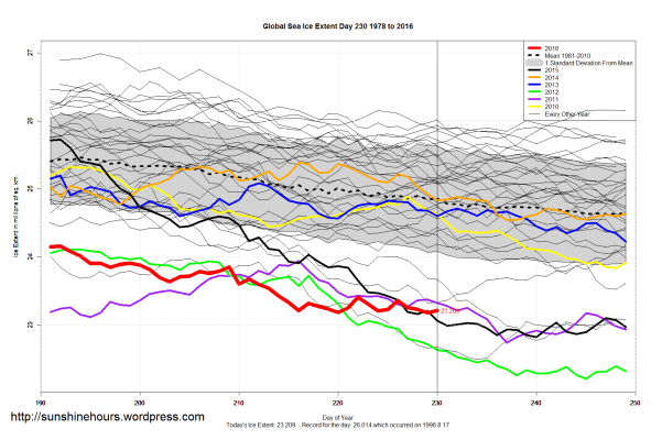 Sea Ice Extent (Global Antarctic and Arctic) – Day 230 – 2016