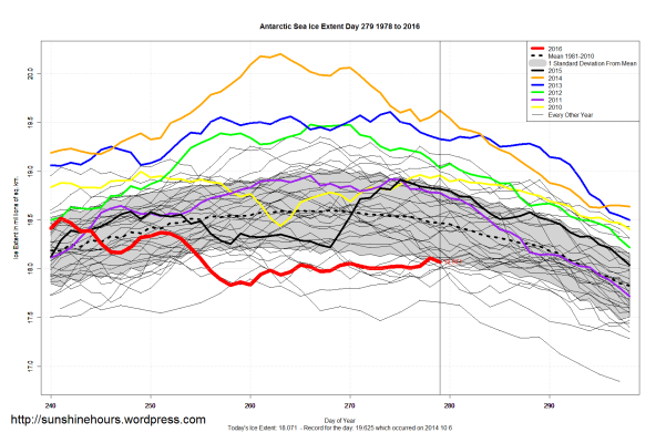 Sea Ice Extent (Global Antarctic and Arctic) – Day 279 – 2016