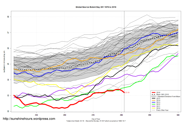 Sea Ice Extent (Global Antarctic and Arctic) – Day 281 – 2016