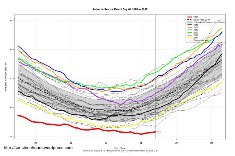 2 thoughts on “Sea Ice Extent (Global Antarctic and Arctic) – Day 64 – 2017