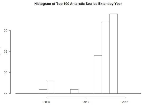 Top 100 Antarctic Sea Ice Extent Histogram