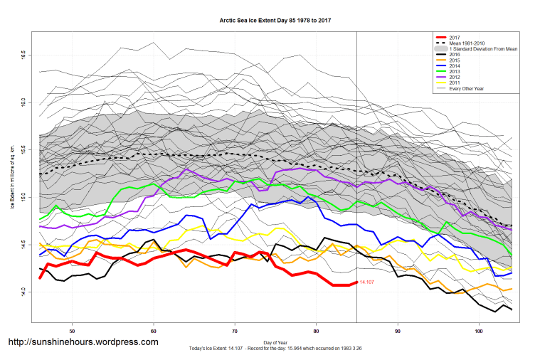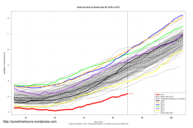 2 thoughts on “Sea Ice Extent (Global Antarctic and Arctic) – Day 85 – 2017