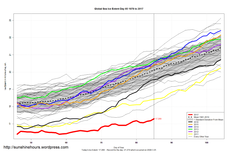 Sea Ice Extent (Global Antarctic and Arctic) – Day 85 – 2017