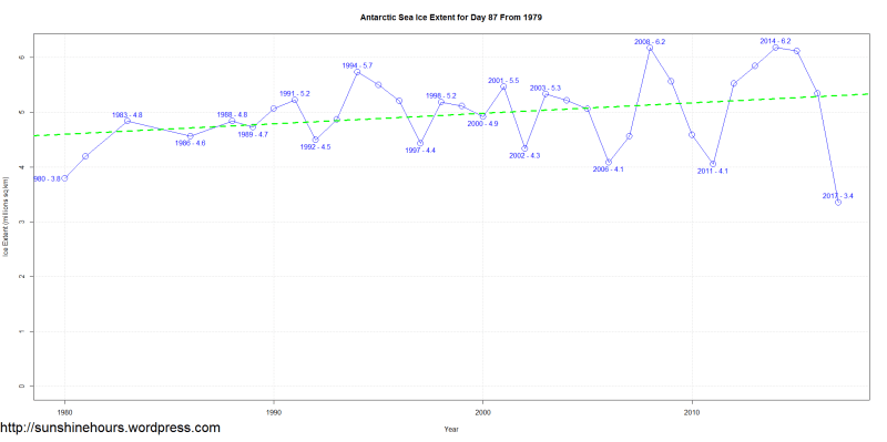 Sea Ice Extent (Global Antarctic and Arctic) – Day 87 – 2017