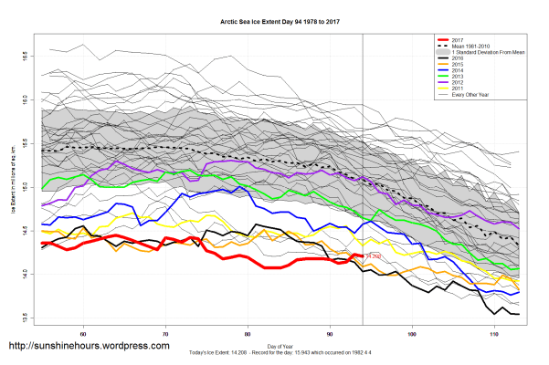 Sea Ice Extent (Global Antarctic and Arctic) – Day 94 – 2017