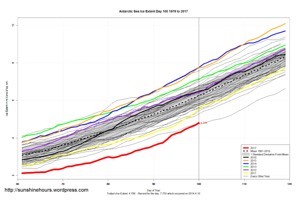 Sea Ice Extent (Global Antarctic and Arctic) – Day 100 – 2017