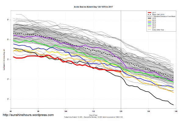 Sea Ice Extent (Global Antarctic and Arctic) – Day 120 – 2017
