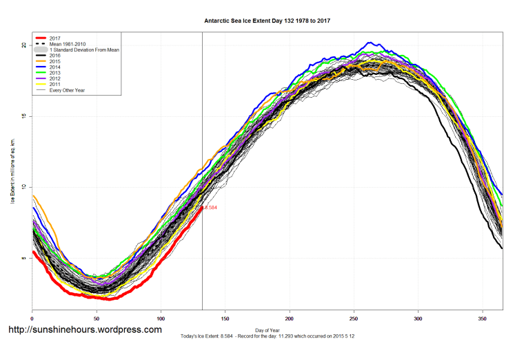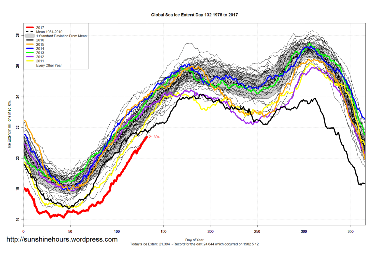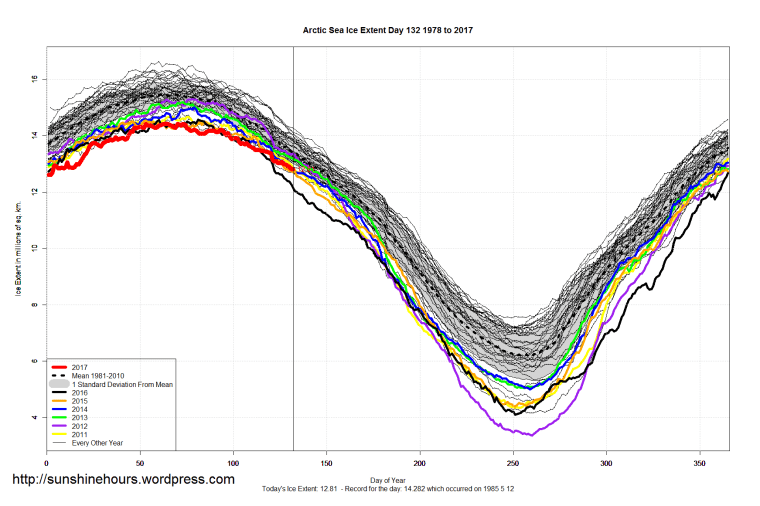 Sea Ice Extent (Global Antarctic and Arctic) – Day 132 – 2017 Published on May 13, 2017May 13, 2017 by sunshinehours1 Arctic for day 132 is 6th lowest … higher than 2004 and 2006 etc South / North Share this: Click to share on X (Opens in new window) X Click to share on Facebook (Opens in new window) Facebook Like Loading... Related