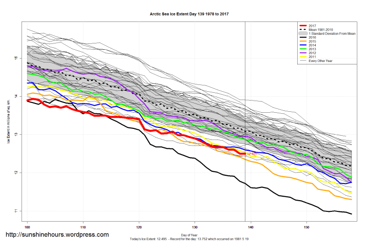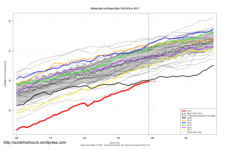 Sea Ice Extent (Global Antarctic and Arctic) – Day 139 – 2017 Published on May 21, 2017May 21, 2017 by sunshinehours1 South / North Share this: Click to share on X (Opens in new window) X Click to share on Facebook (Opens in new window) Facebook Like Loading... Related