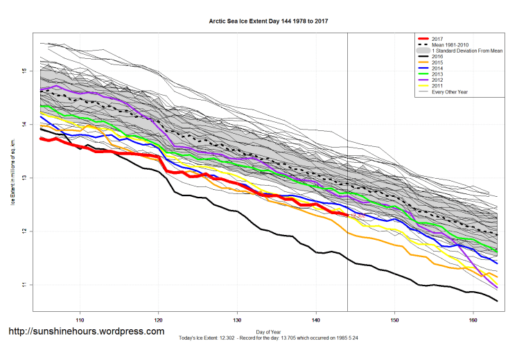 Sea Ice Extent (Global Antarctic and Arctic) – Day 144 – 2017 Published on May 25, 2017May 25, 2017 by sunshinehours1 Arctic Sea Ice Extent day 144 is 800,000 sq km higher than it was in 2016. South / North Share this: Click to share on X (Opens in new window) X Click to share on Facebook (Opens in new window) Facebook Like Loading... Related
