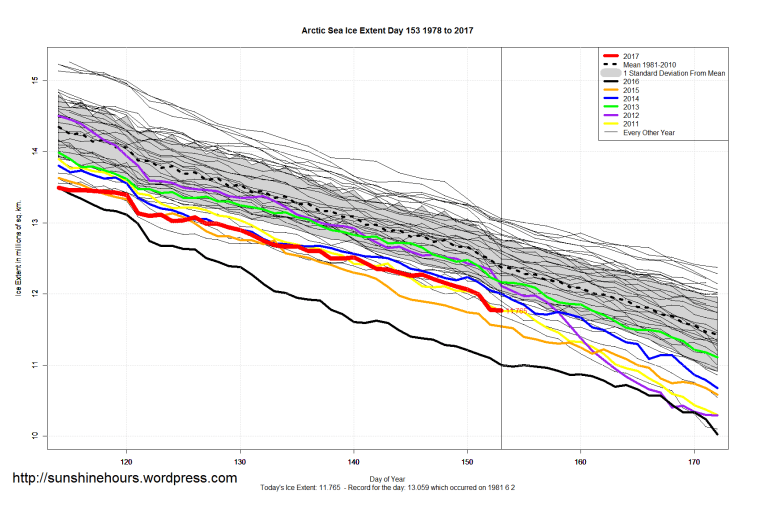 5.54% Anomaly in the Arctic – Day 153 – 2017 Published on June 3, 2017June 3, 2017 by sunshinehours1 Day 153 in the Arctic Extent: 11.76 million sq km Mean: 12.45 million sq km Anomaly: -690,000 sq km Anomaly : -5.54% South / North Share this: Click to share on X (Opens in new window) X Click to share on Facebook (Opens in new window) Facebook Like Loading... Related