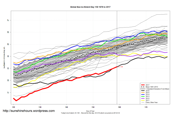 Sea Ice Extent (Global Antarctic and Arctic) – Day 159 – 2017